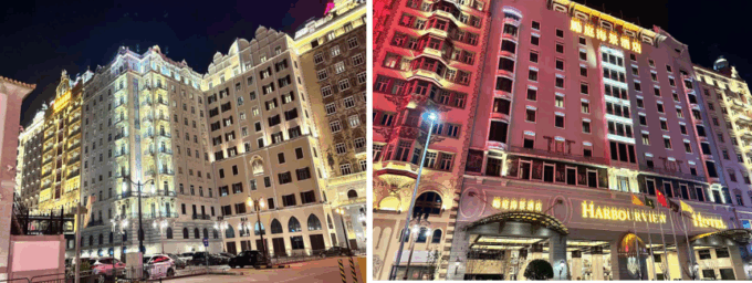 18世紀のチェコのプラハをコンセプトに造られたホテルは豪華な外観で、夜の到着だったので更にネオンで綺麗でした。