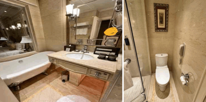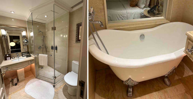 洗面台を挟んで左にバスタブ、右にシャワ-でした。猫足バスタブが可愛かったです。シャワーはガラスで仕切られていましたが、ガラス扉の下から少し水が漏れ、横のトイレ付近まで濡れていたのが残念です💦
