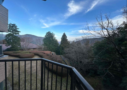 ベランダからの眺めです。鳥の鳴き声が聞こえ、山の眺めも良いですね。癒されました。