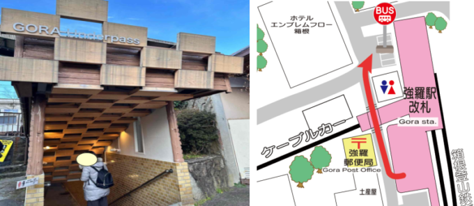・箱根登山バスで約40分、「小涌園」バス停で降り、ユネッサンから通じる小道を通り徒歩約5分、また「天悠」バス停で降り上り坂になりますが徒歩約5~8分で到着です。強羅駅からは約10分です。